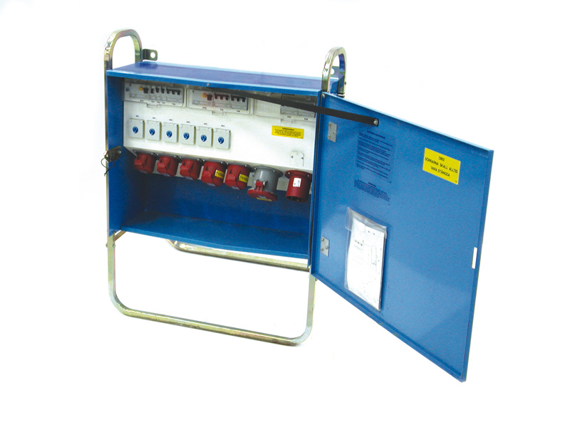 63A/380V. Försedd med följande uttag: 6 st 220 V, 2 st 16A/380V, 2 st 32A/380V