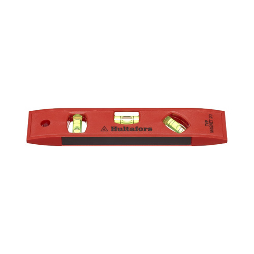 Ett slagtåligt vattenpass i röd ABS-plast, med magneter på undersidan.
